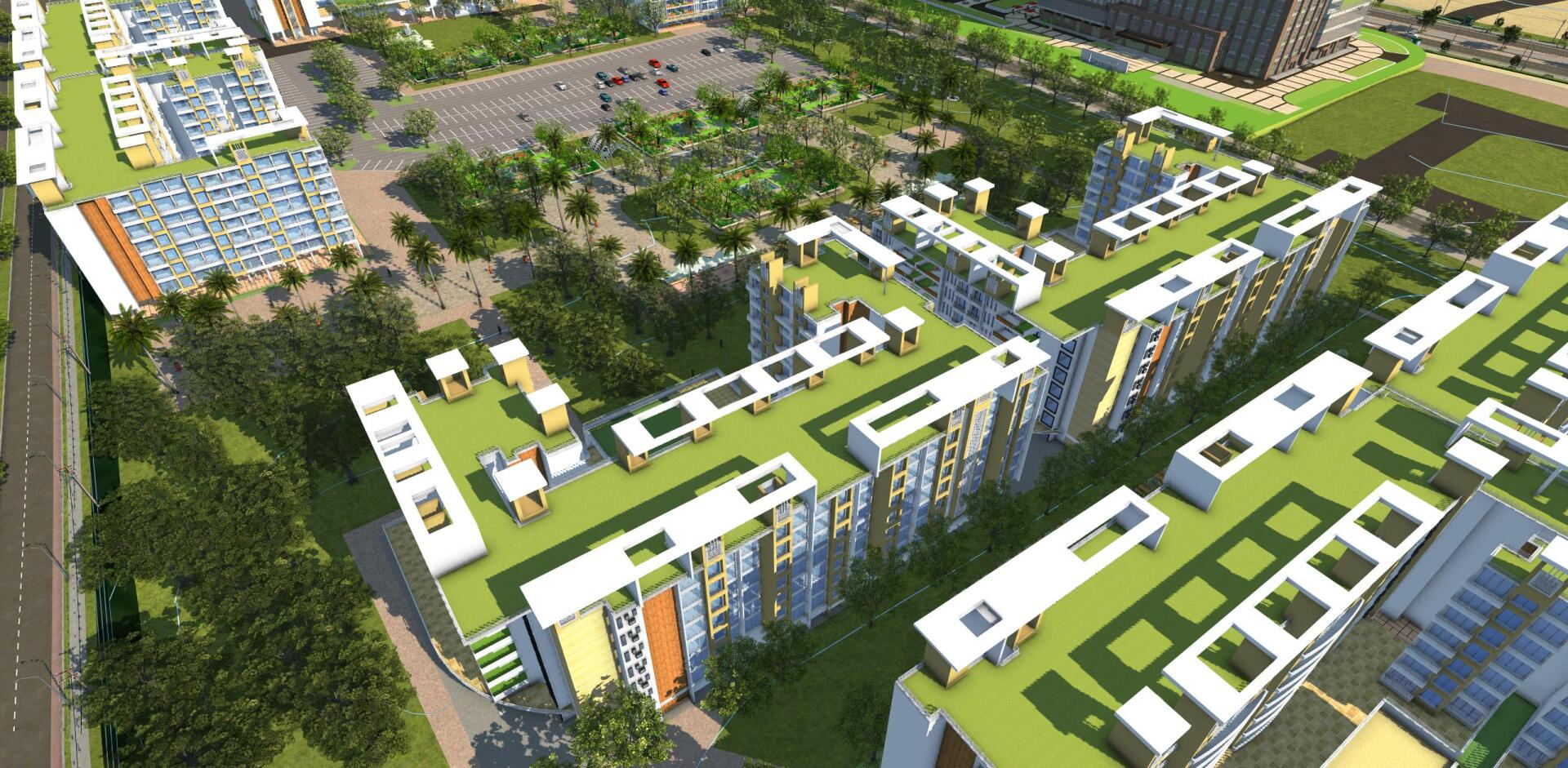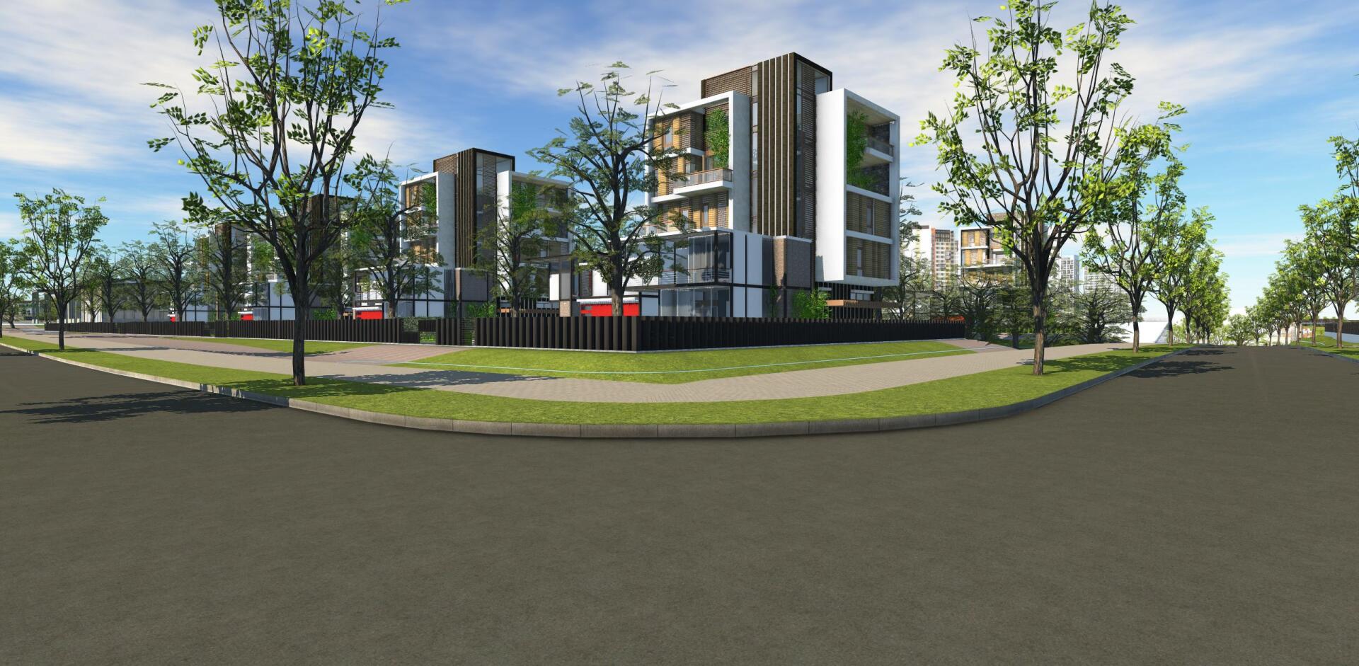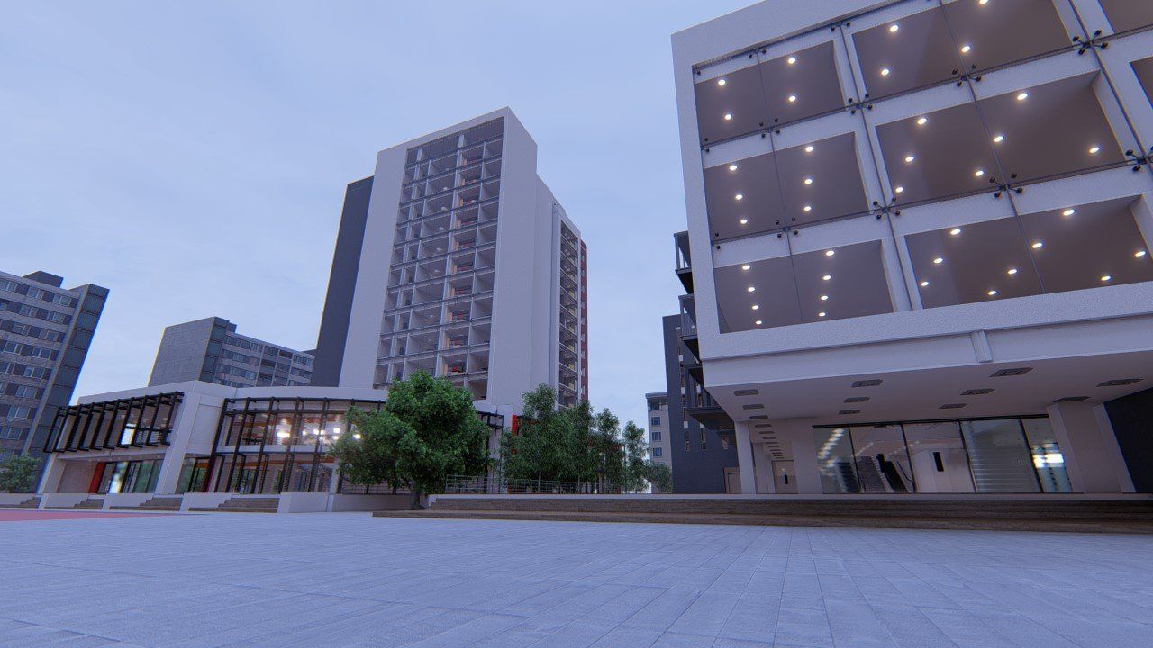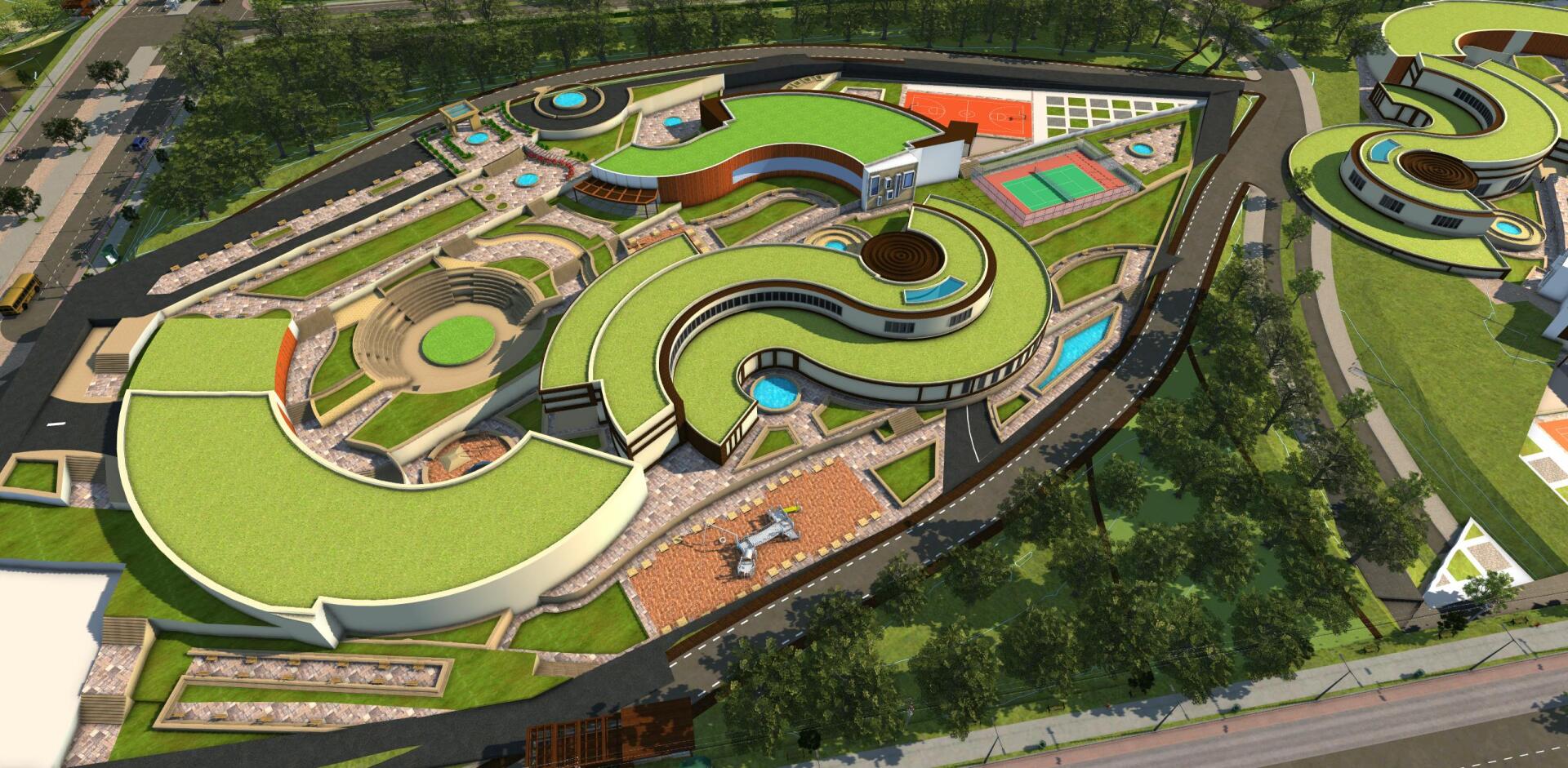 Cette construction en structure de béton armé aux formes rectilignes, blottie sous de grands arbres et entourée de diverses plantes est conçue dans l'optique de l'économie d'énergie et le respect de l'environnement.