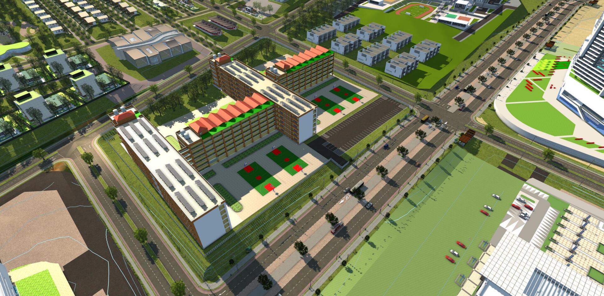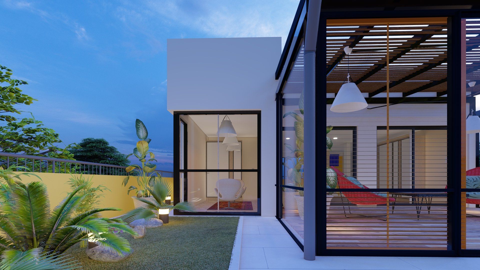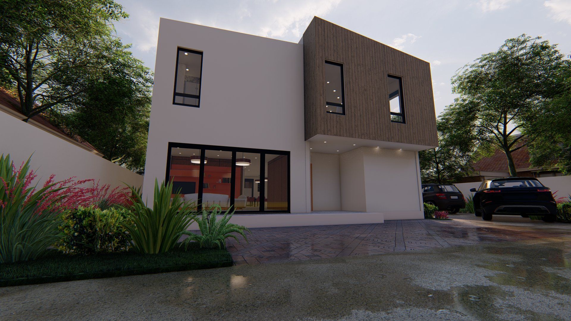 Cette construction en structure de béton armé aux formes rectilignes, blottie sous de grands arbres et entourée de diverses plantes est conçue dans l'optique de l'économie d'énergie et le respect de l'environnement.